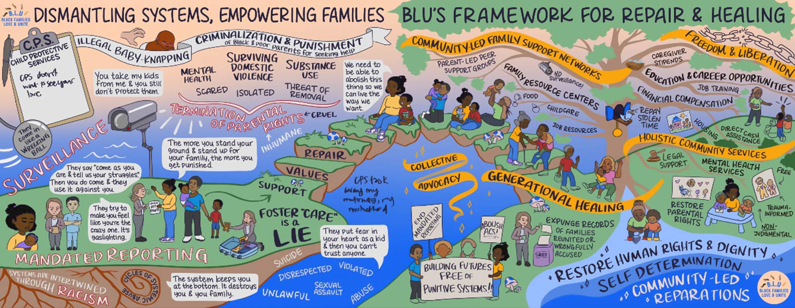 Black Families Love and Unite also published a new report, Families Belong Together, Families Demand Repair, that documents perspectives and ideas collected from a 60-person focus group and survey of over 200 system-impacted children and parents.